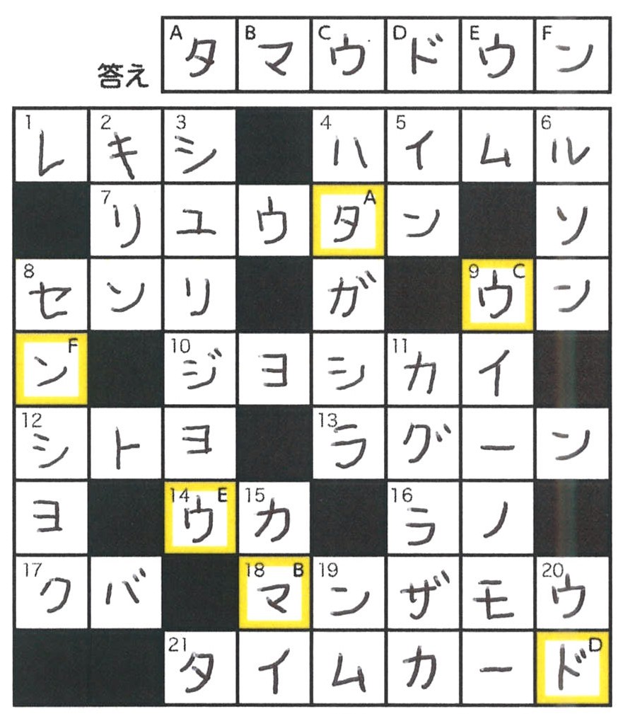 クロスワードぱずるの答え(よしとよ新聞2号掲載)2021年3月23日こんにちは、事務局 わたなべ です。 よしとよ新聞2号(TaN11号)も無事発行できまして。ほっとしております。 初めて作ったクロスワード解くのは得意ですが、作るのには苦労いたしました。お楽しみいただければ幸いです。 回答を掲載いたしますので、気になる方はご覧ください。 では、次号もお楽しみください。 Share: Facebook で共有するにはクリックしてください (新しいウィンドウで開きます) Facebook クリックして X で共有 (新しいウィンドウで開きます) X クリックして LINE で共有 (新しいウィンドウで開きます) LINE クリックして mixi で共有 (新しいウィンドウで開きます) mixi クリックして Pocket でシェア (新しいウィンドウで開きます) Pocket その他 クリックして はてな で共有 (新しいウィンドウで開きます) はてな 関連 その他Posted by 44104